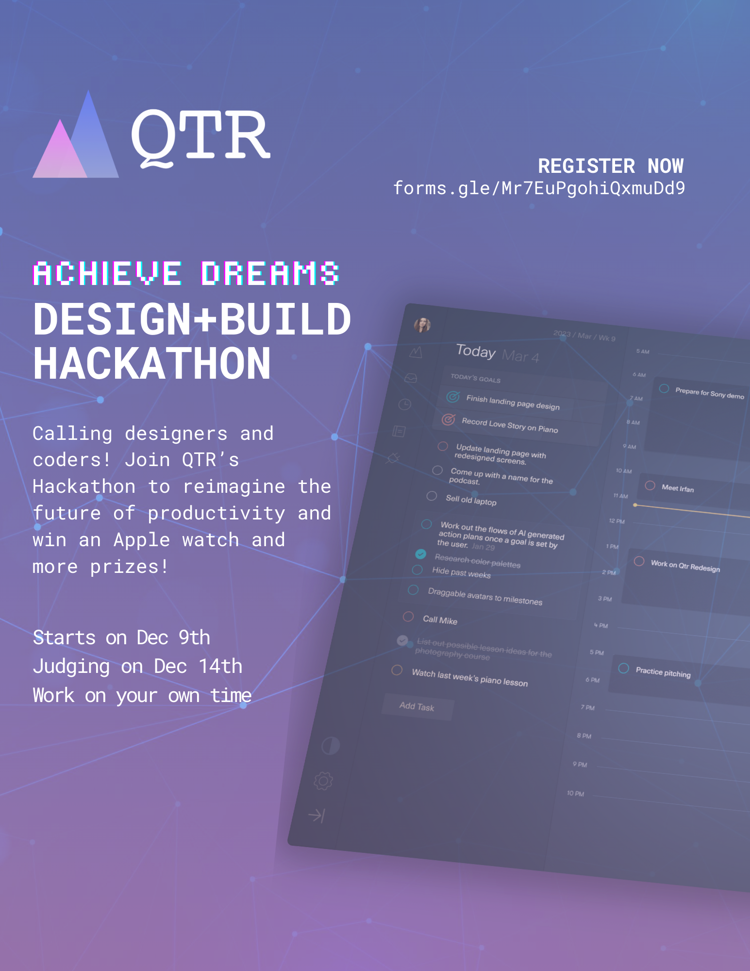 Join us for the QTR Design+Build Hackathon, a week-long event designed to spark creativity, innovation, and collaboration. This is your chance to reimagine QTR's future by crafting engaging solutions that leverage AI, enhance productivity, and redefine platform design. Push boundaries, showcase your talent, and compete for exciting prizes while connecting with like-minded individuals.