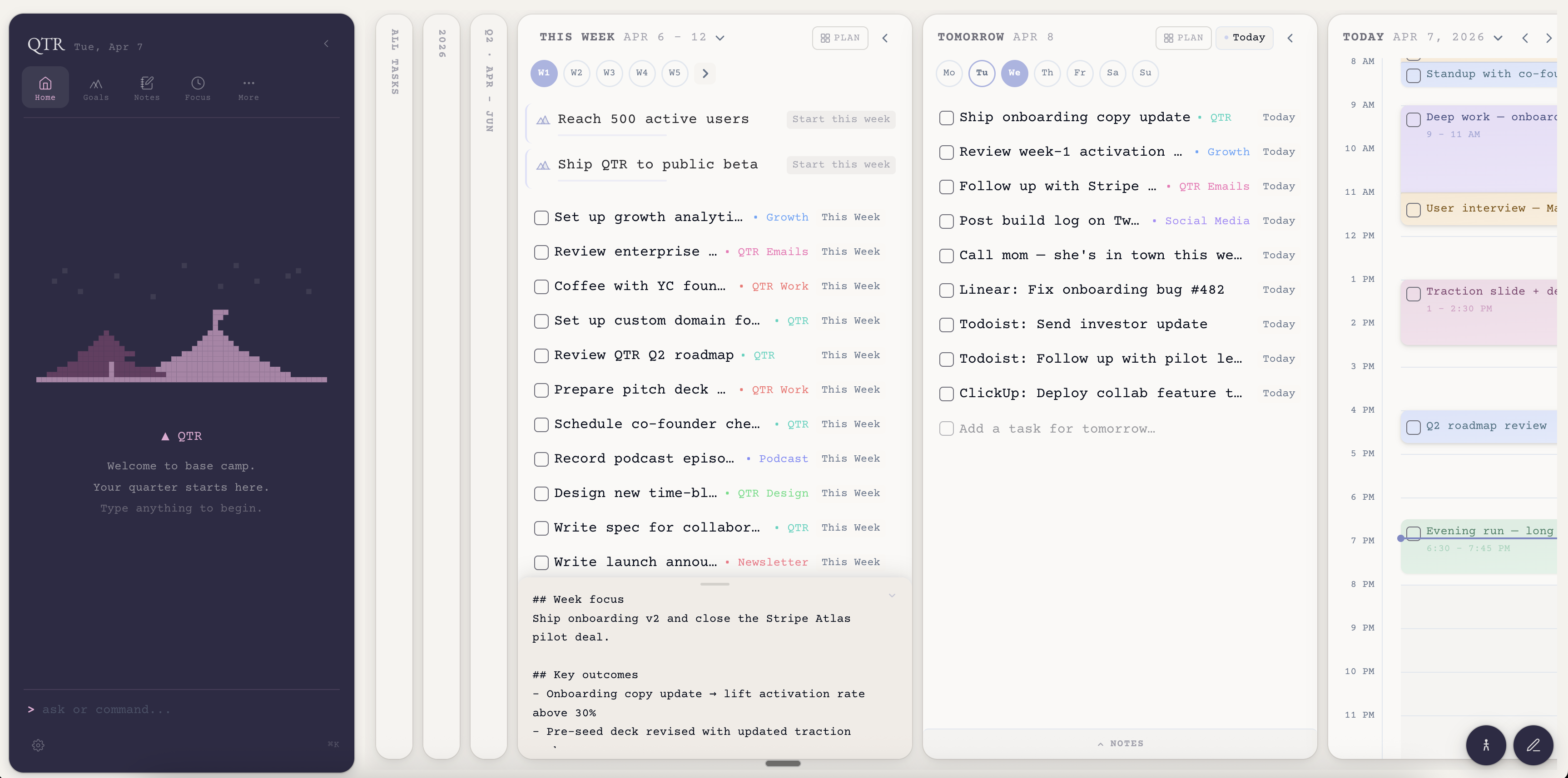 QTR is a to-do app built around backward planning—set big goals, work backward to plan your weeks, then time-block daily tasks.